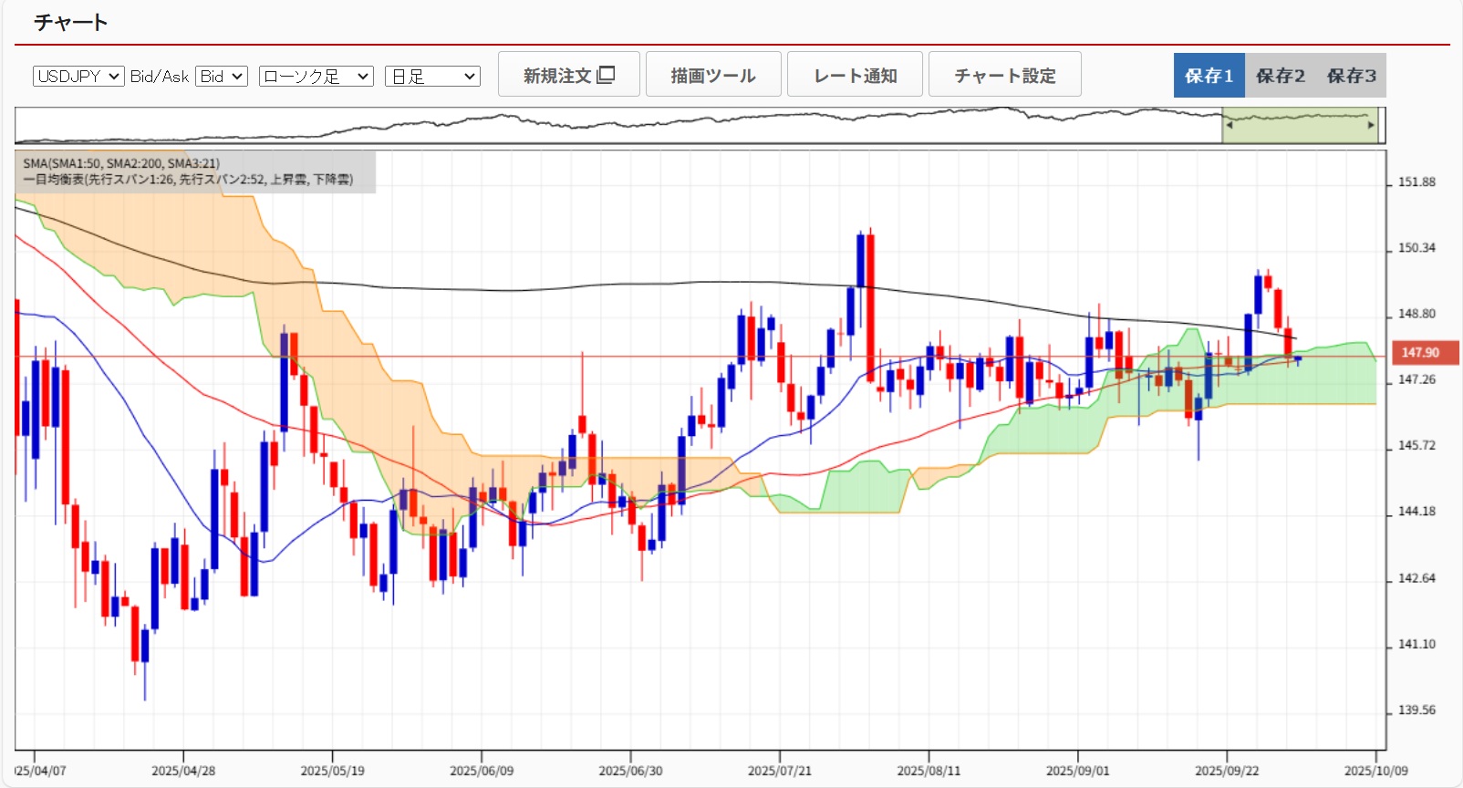 ドル円は米政府閉鎖懸念を受け、一時147.65まで下落する場面がありました。日足200日線を割り込み、レンジ上抜け失敗となっています。