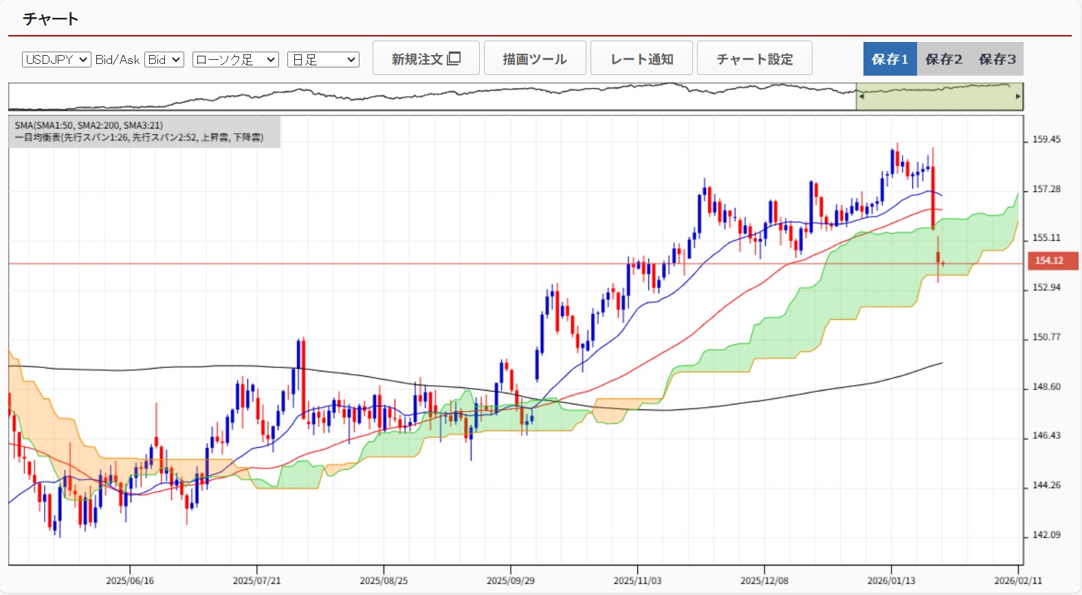 ドル円は一時153.29まで下落し、先週末高値から約6円幅の下落となりました。安値から1円戻して154円前半で引けています。今後は落ち着きどころを探る動きとなりそうです。